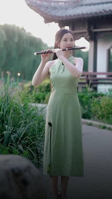 老师黑色双开真丝旗袍的穿着效果
